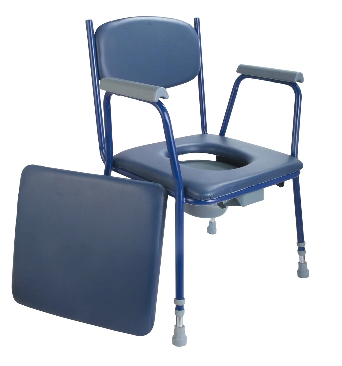 Krzesło BLUE-TIM zostało wykonane na stabilnej stalowej ramie malowanej proszkowo, co zapewnia trwałość i bezpieczeństwo użytkowania. Regulowane nóżki zakończone antypoślizgowymi gumowymi nasadkami pozwalają dopasować wysokość krzesła do indywidualnych potrzeb użytkownika. Boczne podłokietniki wspomagają stabilność i zwiększają poczucie bezpieczeństwa podczas siadania i wstawania. Siedzisko i oparcie zostały tapicerowane miękkim materiałem, co podnosi komfort użytkowania, a łatwo wyjmowany plastikowy pojemnik sanitarny oraz deska sedesowa czynią krzesło funkcjonalnym i wygodnym w codziennym użytkowaniu.