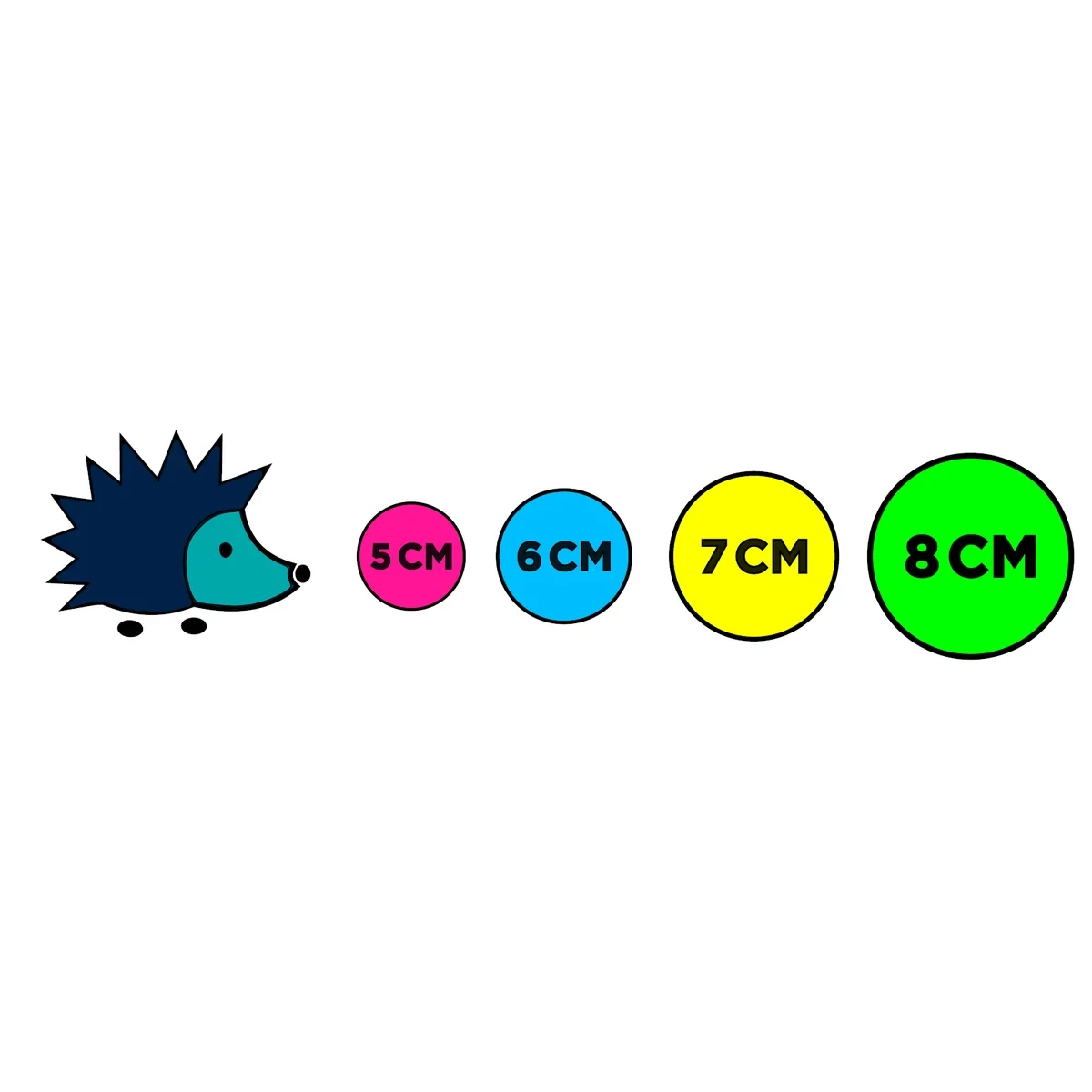 5 cm (Czerwona), 6 cm (Niebieska), 7 cm (Żółta), 8 cm (Zielona)