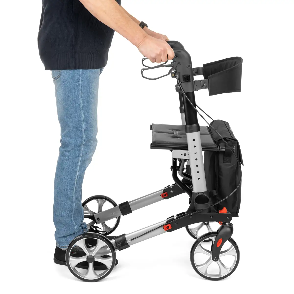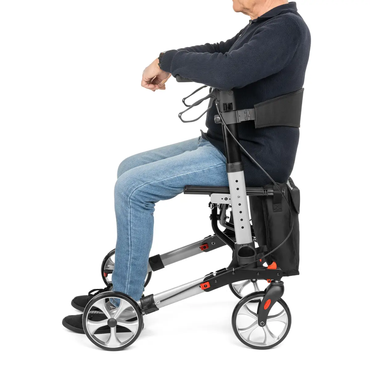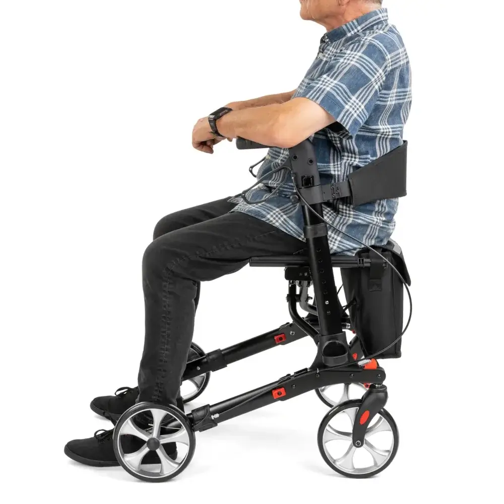 Wytrzymała aluminiowa rama o zwiększonej odporności na nacisk osiowy zapewnia stabilność i solidne wsparcie. Podwójny system hamulców z blokadą postojową pozwala bezpiecznie zatrzymać podpórkę lub usiąść bez ryzyka przesunięcia. Maksymalne obciążenie do 136 kg potwierdza trwałość konstrukcji.